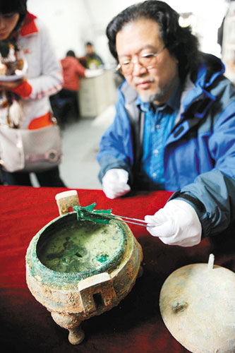 考古隊(duì)隊(duì)長(zhǎng)劉呆運(yùn)展示從銅鼎“骨頭湯”里取出的動(dòng)物骨骼。記者 翟小雪攝