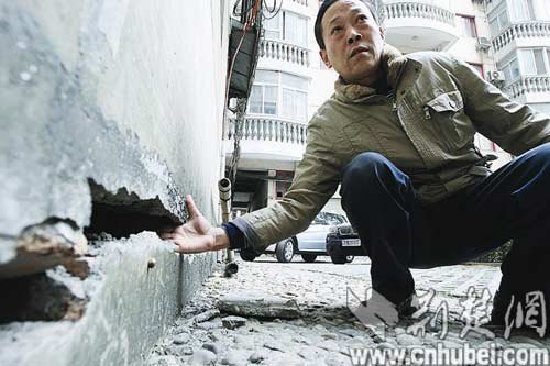 昨日下午,記者接到漢口香港路九運(yùn)長(zhǎng)福公寓居民的求助后,來到現(xiàn)場(chǎng)查看。只見這是一棟14層高的商住兩用樓,共6個(gè)單元,樓內(nèi)住有148戶居民。記者在樓內(nèi)眾業(yè)主的帶領(lǐng)下,在該幢樓3單元與4單元間看到,一面墻的墻腳裂開有20多米的縫隙,裂縫大的竟可以塞進(jìn)一個(gè)拳頭。受墻體裂縫影響,物業(yè)公司設(shè)在一樓的保安室內(nèi)的一個(gè)木門,已經(jīng)嚴(yán)重變形;一樓的幾間商鋪也因墻面出現(xiàn)裂縫,商鋪的門都無法正常開關(guān)。