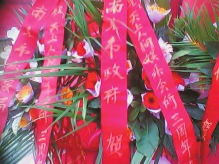 南充“天上人間”國際娛樂會(huì)所3周年慶典活動(dòng)現(xiàn)場(chǎng),大門口擺滿了祝賀花籃,其中兩個(gè)花籃扯人眼球,祝賀單位是“南充市政府”和“南充市公安局”。