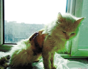 ????背部遭鐵鉤刺穿,腹部?jī)蓚?cè)的皮毛都已空缺,僅脊背處還有一點(diǎn)皮毛留了下來。11月2日,濟(jì)南市民岳淑芹救助了這樣一只貓咪,強(qiáng)強(qiáng)。寵物醫(yī)生估計(jì)是烤羊肉串的人先用鉤子把貓勾起來,然后從身子兩邊各拉一刀,活剝了這只小貓的皮。
