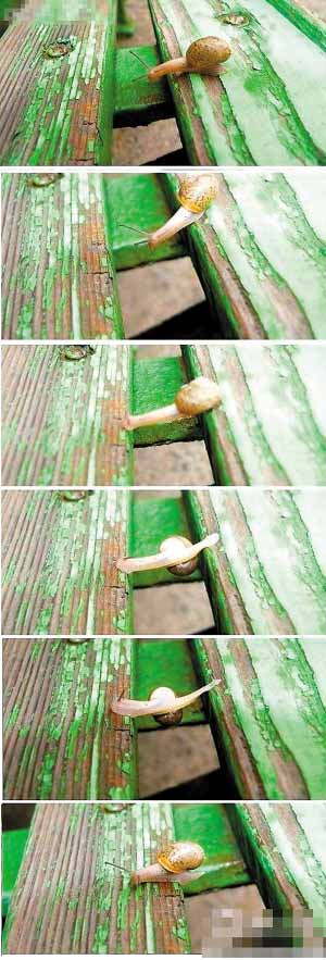 ????一組圖片展現(xiàn)了一只最勵(lì)志小蝸牛。讓網(wǎng)友佩服的是,這只不起眼的小蝸牛,從一根木桿跨至另一根木桿,它的頑強(qiáng)精神感動(dòng)了網(wǎng)友。