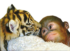 ????在印度的塔曼野生動(dòng)物醫(yī)院,兩只野生蘇門答臘虎和兩只野生猩猩成了朋友。這種友誼注定不會(huì)長(zhǎng)久,幼虎長(zhǎng)到三個(gè)月時(shí)開始吃肉,那時(shí)他們就得跟自己的新玩伴分開。(記者 陳靜 吳顯佳)