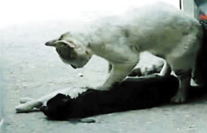 ????土耳其一只流浪小貓?jiān)谕\噲?chǎng)被汽車撞倒后,無助地躺在地上,同伴隨后趕來,用貓掌在昏迷的同伴胸口上心臟按摩,整整2個(gè)小時(shí),希望它能夠醒過來。