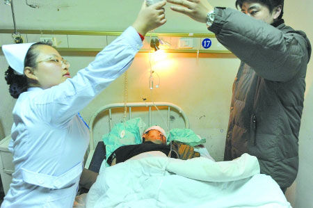 昨天晚上10時(shí)30分,記者趕到河南中醫(yī)學(xué)院第二附屬醫(yī)院。在該院外一科病房,記者看到李火和妻子顏琪瑋正躺在病床上,護(hù)士正在給他們輸血、輸液,他們都已經(jīng)處于休克狀態(tài),意識模糊。顏琪瑋頭部被磨掉大半。