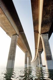 ????經(jīng)歷了三個(gè)多小時(shí)的海上歷程,青島海灣大橋的壯美已深深地印在了我的腦海之中,即使當(dāng)我落筆記錄海上看橋的點(diǎn)點(diǎn)滴滴的時(shí)候,心中的那份激動(dòng)仍沒(méi)有平息?!昂>啊笔乔鄭u最主要的特色,但多少年來(lái),人們?cè)诤_呅蕾p到的,只能是自然的景色。而當(dāng)青島海灣大橋建成之后,膠州灣上將出現(xiàn)青島的地標(biāo)性建筑?!皩?lái),青島的海上旅游會(huì)將海灣大橋作為一個(gè)重要的景點(diǎn)。 ”昨天,城投旅游集團(tuán)有關(guān)負(fù)責(zé)人對(duì)記者說(shuō),青島海灣大橋作為青島的地標(biāo)性建筑,建成后成為青島的一個(gè)重要的旅游資源?!皩?lái),游客來(lái)到青島后,我們會(huì)帶著他們乘飛機(jī)空中看大橋。 ”這位人士介紹,作為世界第一的跨海大橋,海灣大橋?qū)τ慰途哂泻艽蟮奈Α?/p>