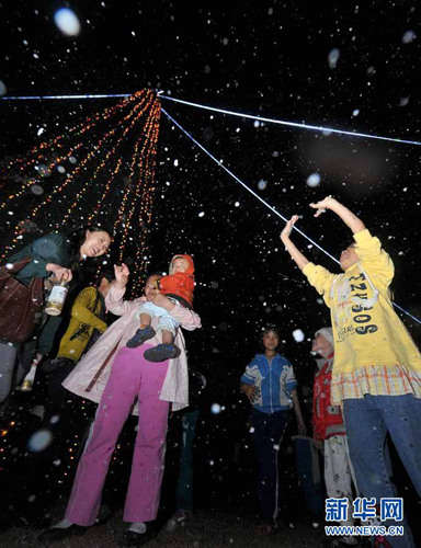 12月24日,市民和游客興奮地在“雪花”中嬉戲。當(dāng)日是平安夜,??谑邪咨抽T公園內(nèi)的飄雪裝置吹起紛紛揚(yáng)揚(yáng)的雪花,讓市民和游客體驗(yàn)到了濃濃的北國(guó)風(fēng)情。郭程攝
