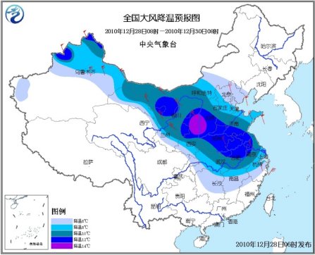 ????中新網(wǎng)12月28日電 中央氣象臺28日清晨發(fā)布寒潮藍色預警,預計,12月28日8時至30日8時,新疆西部和北部、甘肅大部、寧夏、陜西、內(nèi)蒙古中西部、華北、黃淮、江淮、江漢、重慶北部、江南中北部等地將出現(xiàn)6~10℃降溫,其中,新疆北部、內(nèi)蒙古西部、寧夏北部、陜西中北部、山西中南部、山東南部、河南北部和東部、安徽中北部、江蘇中西部等地的部分地區(qū)降溫幅度可達12~14℃;上述大部地區(qū)有4~6級偏北風。