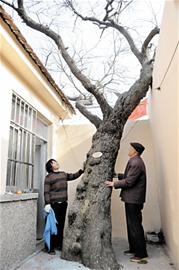 ????記者隨后趕到薛老漢家的院子里看到,他和老伴剛收拾完家當(dāng),正站在古樹旁,讓女兒給他們和古樹合影留念。這棵國(guó)槐在他家院子?xùn)|側(cè),高近十米,樹干直徑約70厘米,樹上貼著一個(gè)牌子,標(biāo)明它今年已經(jīng)309歲高齡。“早在2006年,膠南林業(yè)部門就來(lái)勘察過(guò),把這棵樹列入青島市古樹保護(hù)范圍了?!毖蠞h告訴記者。