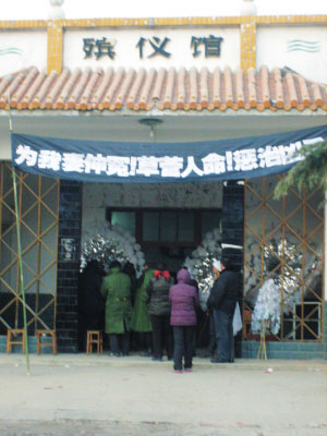 “沒有的事,我們從來就沒接受這一說法?!崩罾蛏暗囊幻従訐u頭對記者說。他指著殯儀館門口懸掛的寫有“草菅人命,懲治兇手”等黑色大字的白色橫幅介紹說:“我們在殯儀館住了三四天了,就是希望能夠有一個公道的說法,希望能夠懲治兇手,告慰死者?!?/p>