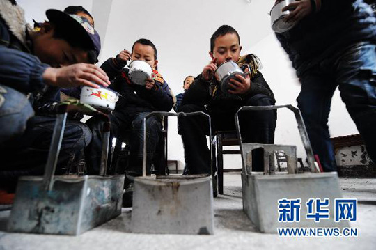 1月6日,湖南新晃縣茶坪學校的孩子們靠近手提火爐在食堂吃午飯。龍弘濤 攝