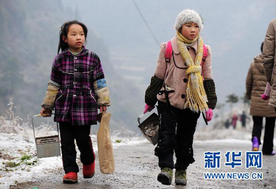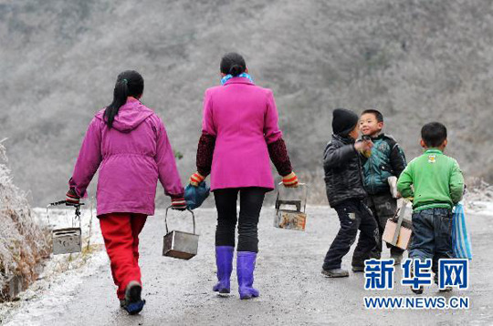 1月6日,湖南新晃縣茶坪鄉(xiāng)放學回家的小學生和他們的家長手提簡易火爐走在冰凍的山路上。龍弘濤 攝
