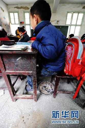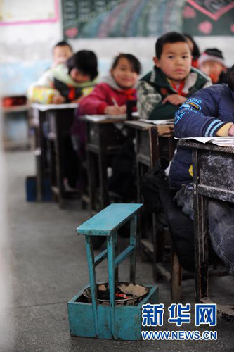 1月6日,湖南新晃縣茶坪學校的孩子們將火爐置于座位下讀書。龍弘濤攝