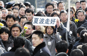 上午11點,夏波的遺體告別儀式結束后,工作人員就要將其遺體進行火化。為防止董薇薇情緒過分激動,警方特地安排了多人進行照看,并請來120急救人員。在眾人的懷中,董薇薇明顯對夏波的離去難以承受,“你們一定要讓我再看他一眼,我想再看看他……”悲切的聲音令人心痛,夏波的女兒系著紅領巾,哭著投入媽媽的懷里。