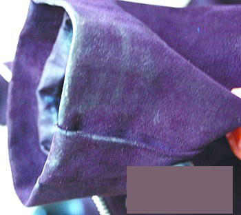 ????領(lǐng)口和袖口較臟,衣服表面蒙有一些塵土。在內(nèi)口袋里放了衛(wèi)生紙,然后把三根皮筋縫在衣服另一側(cè)的褶皺里。