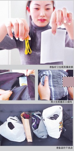 ????送洗前,信報(bào)實(shí)驗(yàn)室在衣服口袋內(nèi)放入兩張衛(wèi)生紙,用灰色的線將口袋縫合,使用這個(gè)辦法來簡單鑒別衣服是水洗還是干洗。因?yàn)楦鶕?jù)衣服干洗的原理,用有機(jī)化學(xué)溶劑對(duì)衣物進(jìn)行洗滌、除掉油污或污漬,衣服被正規(guī)干洗后,內(nèi)口袋里的衛(wèi)生紙形狀不變,水洗后則將成為一團(tuán)。同時(shí)還會(huì)放入三根皮筋,因?yàn)橐路上春笃そ顣?huì)變?cè)闶椥?,而衣服水洗后皮筋彈性依舊。