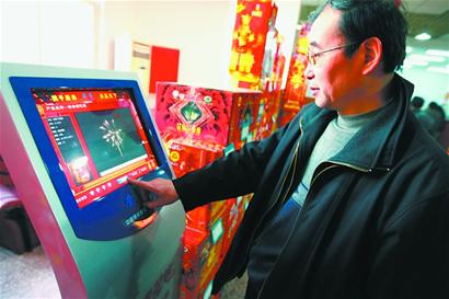 ????在批發(fā)大廳一角,一臺立式的觸屏機引起了記者的注意:觸屏機主頁面顯示“煙花爆竹查詢”,在“產(chǎn)品”頁面中標注有“組合煙花類、鞭炮類、焰火類、玩具煙花、吐珠類、噴花等七八個類別,記者隨機點擊了一個產(chǎn)品,再點“產(chǎn)品視頻”,屏幕便開始播放該種焰火燃放的效果。