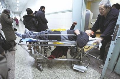 ????記者隨后趕到海慈醫(yī)院,傷者躺在CT室外的擔(dān)架車上,雙手捂住頭部,身體蜷縮,不住地呻吟?!安缓?,傷者出現(xiàn)抽搐癥狀了,趕緊叫醫(yī)生?!奔痹\室的醫(yī)生趕來對其進(jìn)行緊急處置。