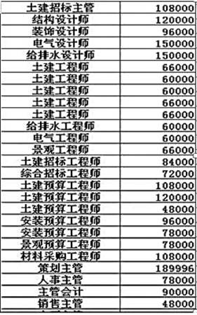 這份工資單中,年薪最高的為總經(jīng)理,549996元;年薪最低的為前臺,1.8萬元。年薪在40萬以上的包括總經(jīng)理、財務(wù)總監(jiān)、開發(fā)副總等6人,年薪在20萬~40萬的包括成本總監(jiān)、研發(fā)副總監(jiān)在內(nèi)的共5人,年薪在10萬~20萬的包括開發(fā)部經(jīng)理、建筑設(shè)計師等20人,其余的年薪均在10萬以下,以6萬元居多。