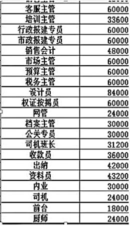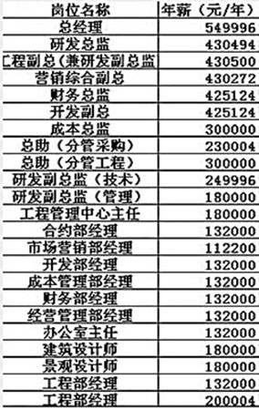 昨日,網(wǎng)絡(luò)上出現(xiàn)一則關(guān)于重慶房地產(chǎn)從業(yè)人員工資待遇的帖子,發(fā)帖者“好時光11”在帖中貼出了一份“重慶某開發(fā)商的詳細(xì)工資表”,當(dāng)中以年薪計算,共涉及70人,從公司總經(jīng)理、研發(fā)總監(jiān)到前臺、廚師,每個人的年薪都一目了然,其中年薪最高的為總經(jīng)理,549996元。昨日,我市某大型房地產(chǎn)開發(fā)商表示,這份工資表內(nèi)容基本屬實,實際上,重慶部分房產(chǎn)商總經(jīng)理年薪可達300萬。