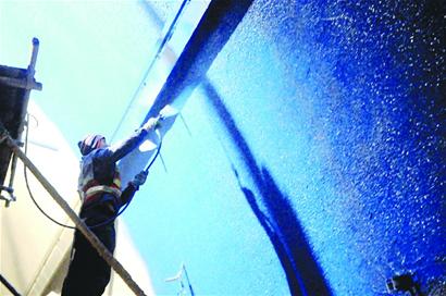 ????汽車(chē)?yán)^續(xù)向前行駛,前方出現(xiàn)了兩臺(tái)直通拱頂?shù)闹Ъ?,工人們正在噴射藍(lán)色的面漆,面漆由裝飾板支架起噴,布滿整個(gè)拱頂,美麗異常。