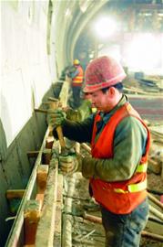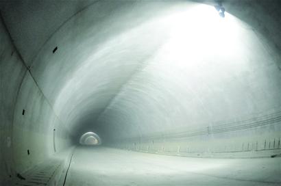 ????汽車(chē)開(kāi)始駛?cè)胨淼?,光線暗了起來(lái)。路面雖然還沒(méi)有鋪設(shè)瀝青,但記者已感覺(jué)到平坦,基本沒(méi)有大的顛簸,抬眼仰望,拱面也很光滑。道路兩旁,電力管溝已經(jīng)建好,工人們正在安裝水槽。按照設(shè)計(jì),隧道內(nèi)的積水將通過(guò)水槽收排,路基加上10厘米厚的瀝青后,路面要稍高于水槽,路面的積水可以方便地流入水槽。 隧道主線視野開(kāi)闊