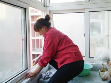 ????“我們干活一般是先擦窗,再打掃衛(wèi)生,打掃衛(wèi)生要先上后下,先里后外?!边@是一處南北朝向的大套二居室,面積大約100平方米左右,王大姐先到廚房,將里面的紙箱等雜物搬出來(lái),騰出地方后,卸下窗戶上的紗窗,交給同伴去清洗。由于天氣過(guò)于寒冷,窗戶被凍住了一時(shí)打不開(kāi),王大姐拿出早就準(zhǔn)備好的螺絲刀,朝窗戶框下端的凹槽刮了幾下之后,稍一用力窗戶就松動(dòng)了。做好這些準(zhǔn)備工作,王大姐拿出自己帶的雙面擦玻璃器,開(kāi)始擦廚房玻璃,十幾分鐘之后,原本臟兮兮的窗戶就變得干凈了,此時(shí)同伴也洗好了紗窗,兩人一起把紗窗裝上,這部分算是“完工”了。