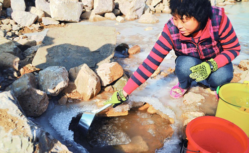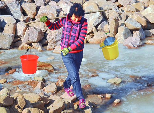 ??1月23日,北宅街道暉流社區(qū)居民李秋蘭在挑水。