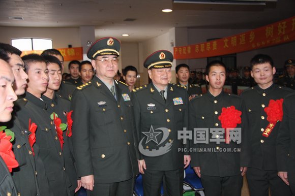 沈陽軍區(qū)司令員張又俠、政委黃獻忠與退伍老兵合影留念,居中右一為張又俠、右二為黃獻忠。