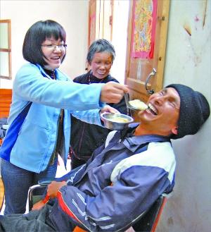 丘芹英是梅縣石扇鎮(zhèn)巴莊村三棟自然村一位有3個孩子的母親。40多年來,她丈夫長年體弱多病無法干重活,3個兒子一出生便相繼患怪病而癱瘓,面對苦難的家庭,今年已經(jīng)66歲的丘芹英用客家女性的勤勞、堅強、善良詮釋偉大、仁慈無私的母愛,硬是靠肩扛、用手抱將3個癱瘓兒子撫養(yǎng)成人,用她無私的母愛和客家婦女的善良與堅強,苦苦支撐著這個苦難的家庭走過了風風雨雨。2007年11月21日,本報A24版以《慈母背癱兒走過40年》為題報道了丘芹英一家的不幸和丘芹英無私博大的母愛后,感動了包括何方等驢友們在內的許許多多讀者。從那時開始,每年春節(jié)和丘芹英一家人一起吃個年飯送慰問品成了梅州驢友們春節(jié)前最重要的活動之一,今年已是第4個春節(jié)。