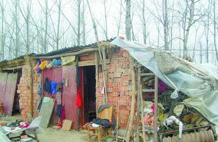 村民孫世虎家有4代11口人,拆遷后一時(shí)找不到合適的住所,就將廢棄的豬舍簡(jiǎn)單加高、修葺,一家人就住在里面?!白×丝彀肽炅?,連春節(jié)也是在里面過(guò)的。”孫世虎說(shuō),全家11個(gè)人擠在近50平方米的窩棚里。“中間拉個(gè)簾子,里面睡覺(jué),外面做飯?!?/p>