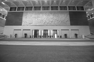 1940年,在中國(guó)人民抗日戰(zhàn)爭(zhēng)的艱難時(shí)刻,藝術(shù)大師徐悲鴻先生創(chuàng)作了一幅震撼人心的《愚公移山》油畫。如今,這幅中國(guó)油畫史上最精彩的作品之一,被做成一幅寬36米、高12米的巨大浮雕,在國(guó)博西大廳正面墻上迎接著每一位參觀者。浮雕對(duì)面,是7扇十多米高的銅門,透過(guò)門上的青銅鏤空?qǐng)D案,可以看見(jiàn)人民大會(huì)堂和天安門廣場(chǎng)。