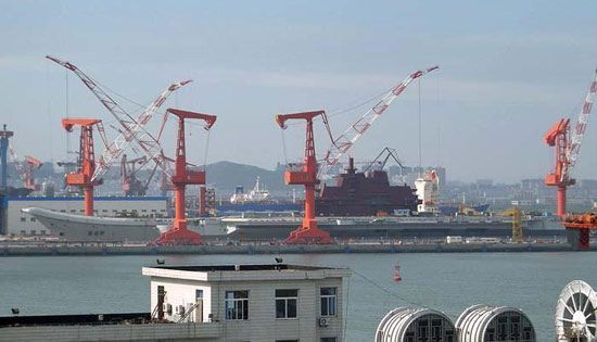 資料圖:在大連進(jìn)行改裝的瓦良格號航母。