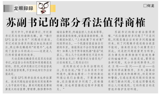 24日晚,蘇志佳從《羊城晚報》上看到何龍撰寫的評論《蘇副書記的部分看法值得商榷》(見半樣圖),當(dāng)即表示想約談何龍,聊聊廣州公務(wù)車管理的事。