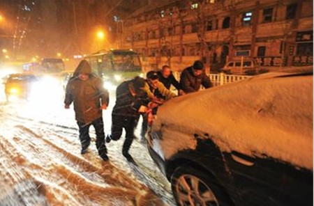 ????昨夜一場大雪突然降臨,對有車一族們是場不小的考驗。昨夜今晨,記者在采訪中了解到,不少司機乃至路人紛紛走上馬路,幫助過往“拋錨”車輛推車,上演了感人互助的一幕幕。