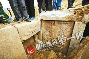 昨日,西永鎮(zhèn)文化服務(wù)中心主任祁華富介紹,此處是建成渝快速鐵路的工地。上周六對山體施工時(shí),挖掘機(jī)刨到硬物,再刨則濺出火花———鐵齒撞擊到石質(zhì)堅(jiān)硬的墓室蓋。接下來,村委會接到施工方通報(bào),鎮(zhèn)里庚即派專人晝夜值守。