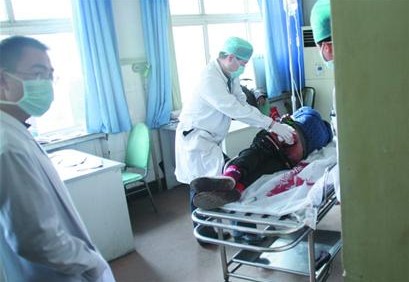 下午2時左右,記者趕到海慈醫(yī)院急診室時,急診室中站滿了會診的醫(yī)生,只見傷者腹部掛著一袋血漿為傷者補血。當(dāng)醫(yī)護(hù)人員輕輕幫傷者翻身時,記者看到他的左腿根部有一個拳頭大小的口子,鮮血不斷往外流,醫(yī)生立即用繃帶將傷口緊緊包扎住?!巴葎用}斷了,膀胱被捅破了,不用說別的,救治不及時的話光失血也是致命的?!币幻麜\醫(yī)生向記者介紹說。