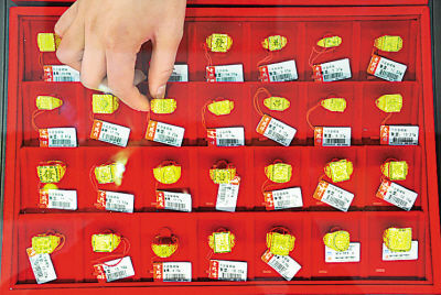受到美元走強(qiáng)和國(guó)際油價(jià)下跌等利空的打壓,紐約商品交易所黃金期貨價(jià)格3月10日大幅下挫。市場(chǎng)交投最活躍的4月合約收于每盎司1412.5美元,比前一交易日下跌17.1美元,跌幅為1.2%。圖為山西萬(wàn)榮一金店店員在擺放黃金戒指。(閆鑫 攝 新華社發(fā))