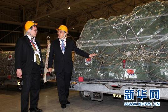3月14日晚,中國駐日大使館公使呂克儉(右)和日本外務(wù)省亞洲大洋洲局日中經(jīng)濟室室長古谷德郎在東京羽田機場完成中國首批對日地震援助物資交接儀式。新華社記者馮武勇攝
