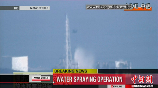 日本防衛(wèi)省17日表示,陸上自衛(wèi)隊(duì)的兩架直升機(jī)已開始向福島第一核電站三號(hào)機(jī)組注水。據(jù)NHK電視臺(tái)報(bào)道,當(dāng)?shù)貢r(shí)間17日上午11時(shí)01分左右,自衛(wèi)隊(duì)兩架直升機(jī)開始對(duì)第一核電站三號(hào)機(jī)組開始注水作業(yè)。這樣的注水作業(yè)據(jù)信已進(jìn)行了至少四次。圖為直升機(jī)向福島第一核電站三號(hào)機(jī)組注水過程的電視截圖。