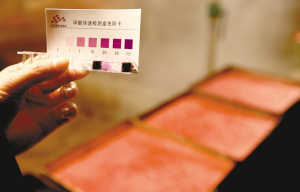 工商執(zhí)法人員通過(guò)甲醛快速檢測(cè)色階卡,測(cè)出血旺含有大量甲醛。(記者 錢(qián)波 攝)