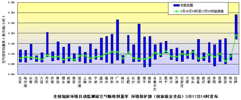 ????環(huán)境保護部(國家核安全局)有關負責人今日介紹說,環(huán)境保護部(國家核安全局)3月17日16時繼續(xù)發(fā)布全國省會城市和部分地級市輻射環(huán)境自動監(jiān)測站實時連續(xù)空氣吸收劑量率監(jiān)測值。監(jiān)測結果匯總圖中綠色曲線代表監(jiān)測值,藍色柱體代表天然本底水平,綠色曲線均在藍色柱體范圍內。監(jiān)測結果表明我國環(huán)境輻射水平未受到日本核電事故的影響。