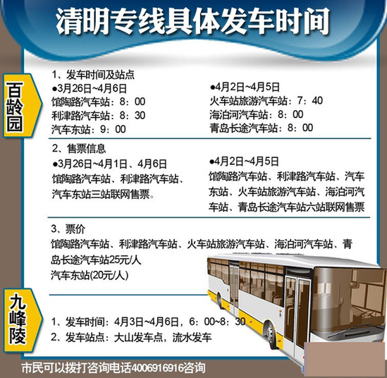 ????清明節(jié)即將到來(lái),3月23日,記者從青島交運(yùn)集團(tuán)了解到,為方便市民掃墓,從3月26日開(kāi)始一直到4月6日,交運(yùn)集團(tuán)將安排車(chē)輛到百齡園和九峰陵兩地。(記者 昌旭光)
