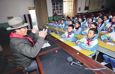 ????拉薩市城關(guān)區(qū)繞賽居委會(huì)貢桑(左)為城關(guān)區(qū)第二小學(xué)小學(xué)生們演講。