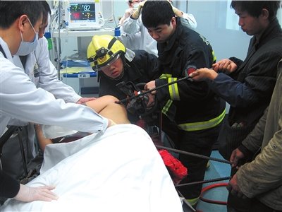 消防人員正在用液壓鉗剪斷鋼筋。朝陽門消防中隊供圖 昨天早晨7點半,朝陽區(qū)首城國際北側(cè)一在建工地C區(qū)內(nèi),一名工人在作業(yè)時,不慎從6米高處墜下,落地時被操作臺面上豎起的三根鋼筋刺入身體,附近工人急忙持焊槍將鋼筋鋸斷,男子背插鋼筋送醫(yī),現(xiàn)已脫離生命危險。 工地工友稱,昨天早晨7點半,工人侯先生(音)在6米高處的樓上施工,當時正在搭腳手架,不慎失足墜落。工友說,只聽侯先生驚叫一聲,大家急忙跑上前,發(fā)現(xiàn)其正好落在鋼筋堆中。幾秒鐘后,鮮血從他背部流出,將衣褲染紅。眾人立即報警。 工友說,侯先生被鋼筋“固定”,無法移動,“直接搬上救護車肯定不行”,眾人商量后決定,利用焊槍等工具,將其背部的3根鋼筋鋸開,“也不敢鋸太短,怕傷到皮肉”。隨后,急救人員趕到,侯先生背插三根鋼筋被送到朝陽醫(yī)院進行搶救。 昨天上午,記者趕到醫(yī)院時,侯先生仍在手術(shù)室搶救。醫(yī)生稱,工人身上共插入3根鋼筋,分別從左肩、左下背和左臀部位插入其體內(nèi),裸露體外1米多長,“流血不止,血壓沒有,只有心跳”,醫(yī)生在匯報情況時說。 隨后,由專家組成的醫(yī)療團隊進入搶救室。專家檢查后稱,其中一根鋼筋從背部插入,可能傷及腎區(qū),也是三根中插入部位最危險的一根。因鋼筋伸出體外較長,醫(yī)生無法正常手術(shù),無奈之下,院方向消防員求助。 朝陽門消防中隊接警后趕到醫(yī)院,3名消防員進入手術(shù)室,使用液壓鉗等設(shè)備,將侯先生體外1米多長的鋼筋剪斷到10厘米左右,醫(yī)生急忙上前,繼續(xù)為傷者醫(yī)治。 昨晚7點,傷者體內(nèi)鋼筋被取出,現(xiàn)已脫離生命危險,并轉(zhuǎn)入病房繼續(xù)治療。據(jù)了解,該工人為四川南充人,工地方已為傷者墊付了5萬元醫(yī)療費用,現(xiàn)其家屬已得知此事,目前正在趕往北京的途中。(記者 韓大鵬 周鑫) |