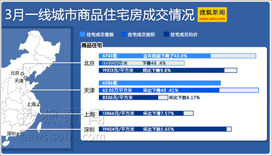 ????北京出現(xiàn)的情況并非個案,天津、杭州、上海、深圳等地也出現(xiàn)了成交縮水、房價下行的態(tài)勢。中國指數(shù)研究院的監(jiān)測顯示,2011年3月天津市商品住宅成交6286套,成交面積62 .02萬平方米,環(huán)比下降40 .41%,均價8326元/平方米,環(huán)比下跌6.17%。價格波動雖較為緩和,但已連續(xù)四個月下行。該院數(shù)據(jù)顯示,3月上海市商品住宅成交均價為13806元/平方米,環(huán)比下滑7.57%;3月深圳市商品住宅成交均價為19424元/平方米,環(huán)比下跌5.65%。