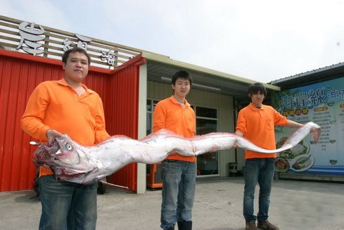 臺灣竹南鎮(zhèn)龍鳳漁港謝姓漁民6日在苗栗近海捕獲一尾長3.8米、重29臺斤(1臺斤=0.6千克)的皇帶魚,旋后以1萬元新臺幣賣給附近海產(chǎn)店。而民眾則憂心臺灣可能要發(fā)生大地震。