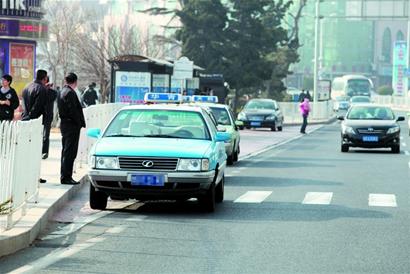 記者隨后在第一海水浴場公交車站看到了類似情況。盡管這里為了公交車??刻匾庑奁隽烁蹫呈秸军c,幾部出租車“嘗”到甜頭,索性排著隊等在港灣式車站內(nèi) “靠活”,無奈之下公交車又被擠到了車行道上停靠。