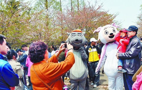 ????4月23日上午,記者來到了中山公園,恰逢周六,中山公園內(nèi)游人如織。記者沿著公園主道開始朝著動物園方向走,大約走到中間位置時,兩只“羊”兩只“狼”出現(xiàn)在記者的眼前,由于四個卡通人物身軀比較大,道路直接被他們占住,再加上有游客跟他們拍照,周圍很快就出現(xiàn)了擁堵。