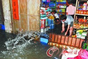 河源市區(qū),雨水漫進店內(nèi),店主奮力“抗洪”。記者曾煥陽 攝