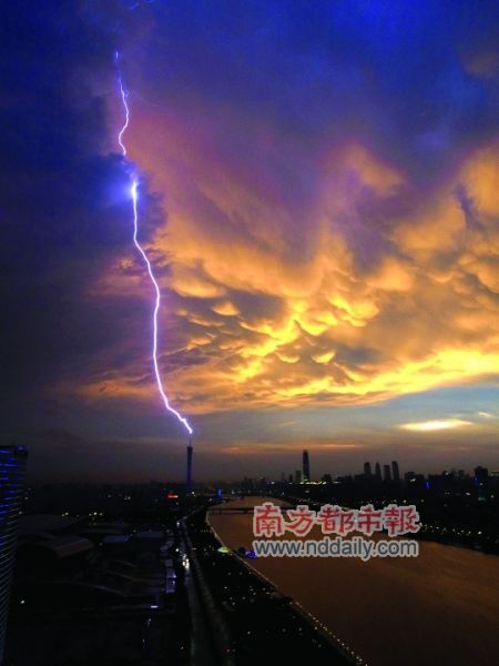 ![]() 廣州昨晚雷雨大作,晚7時(shí)許,一道閃電擊中“小蠻腰”(南都拍客 張德智 攝)